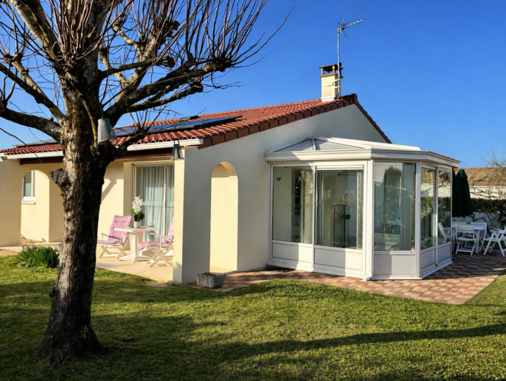 Maison familiale de plain-pied avec jardin privatif et véranda lumineuse, située dans un quartier calme à proximité de la mer, du parc et des commerces.