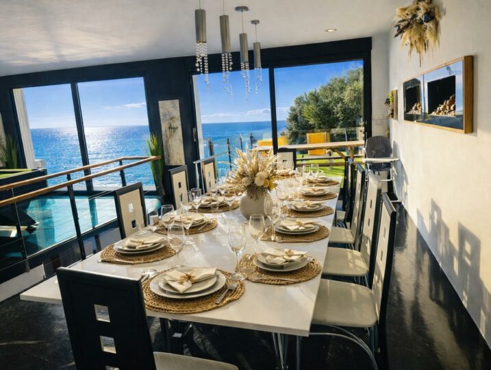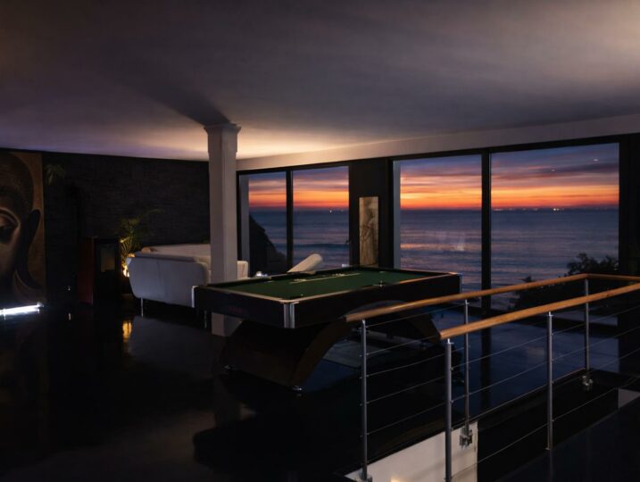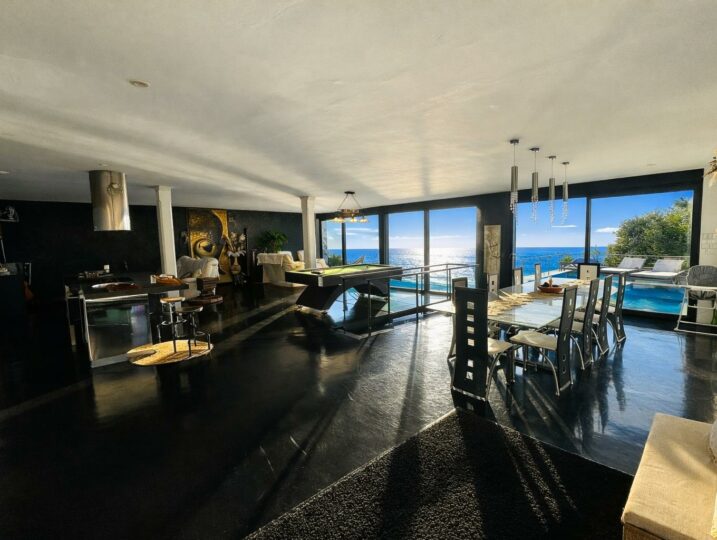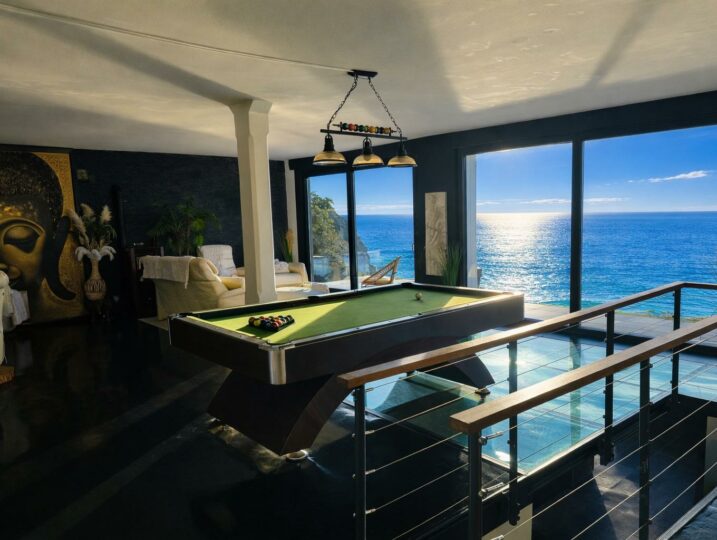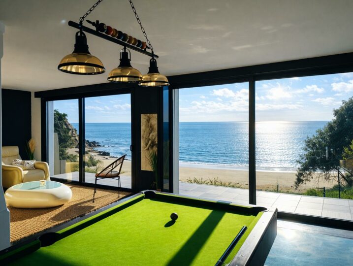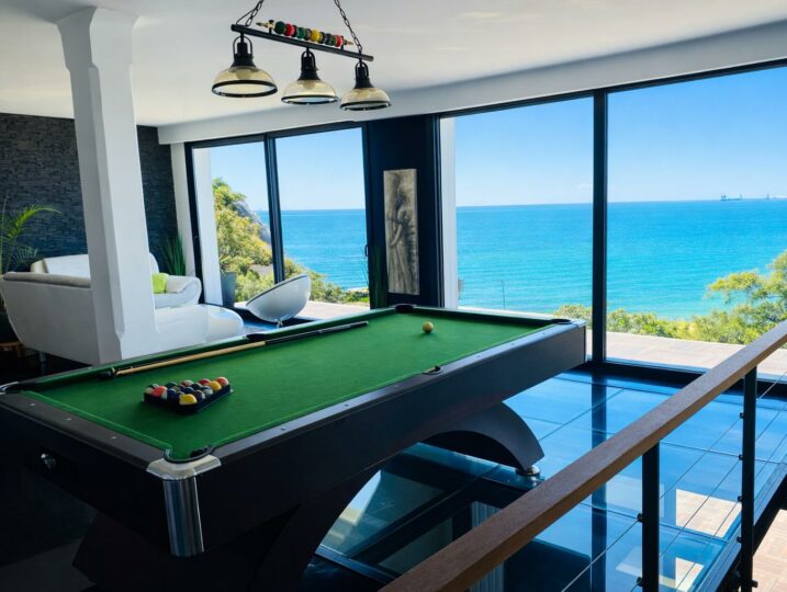 À l’intérieur, chacun trouve sa place : un grand salon vue mer, une cuisine équipée, et des espaces “plaisir” qui font la différence (billard, salle de cinéma, sauna, jacuzzi).