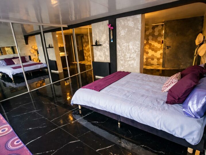 4. Chambre / espace nuit : 55 m² vue mer – séparé par rideau – SDB balnéo + WC – 1 lit simple + 2 lits doubles – TV