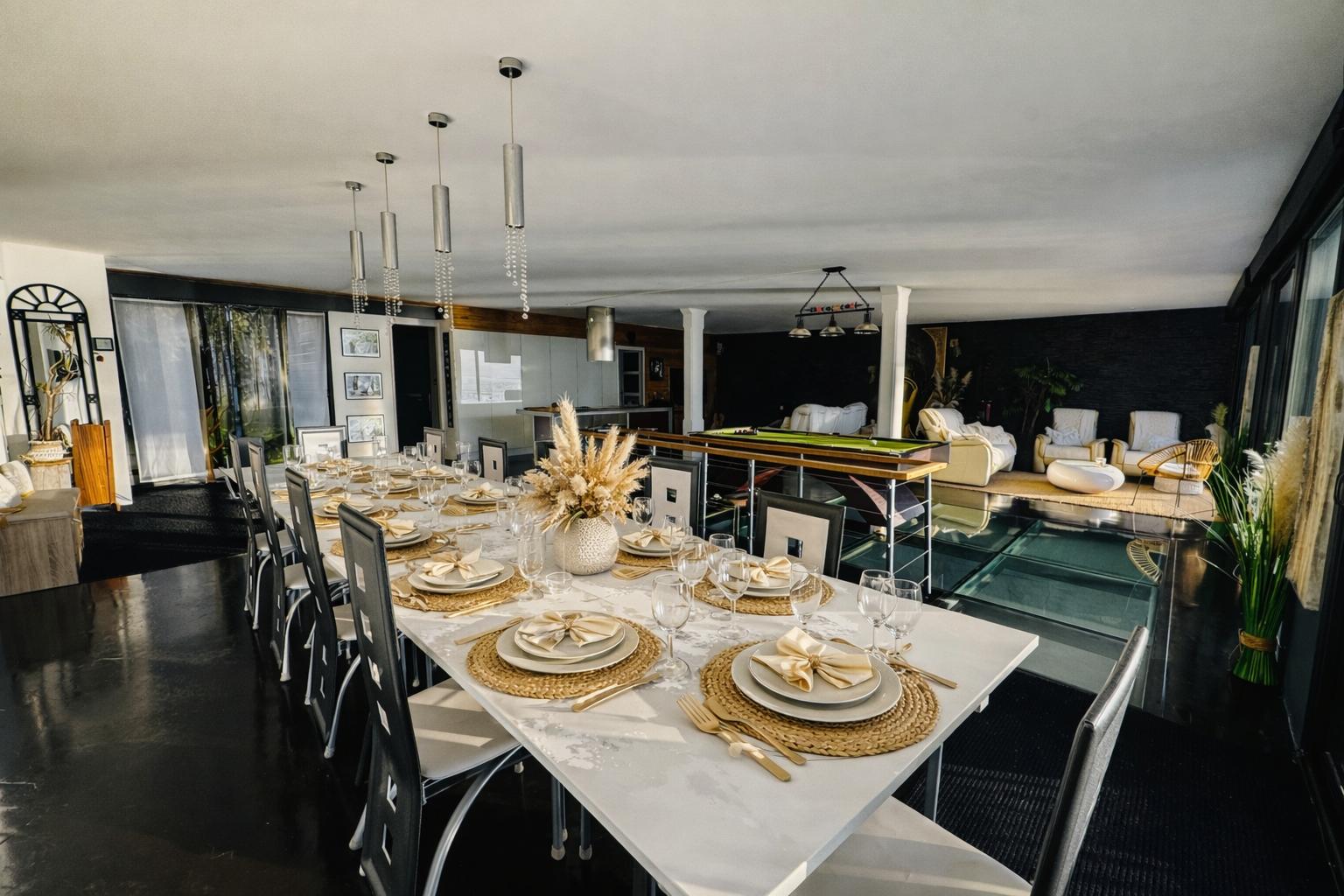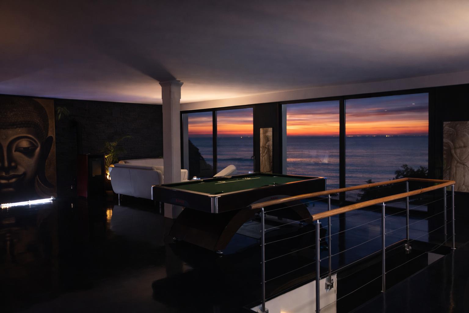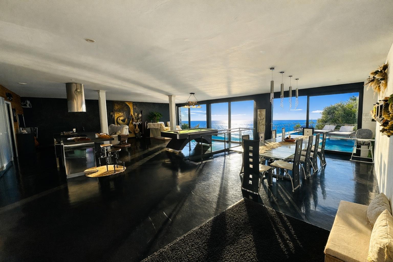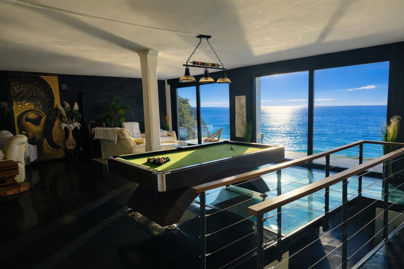 À l’intérieur, chacun trouve sa place : un grand salon vue mer, une cuisine équipée, et des espaces “plaisir” qui font la différence (billard, salle de cinéma, sauna, jacuzzi).