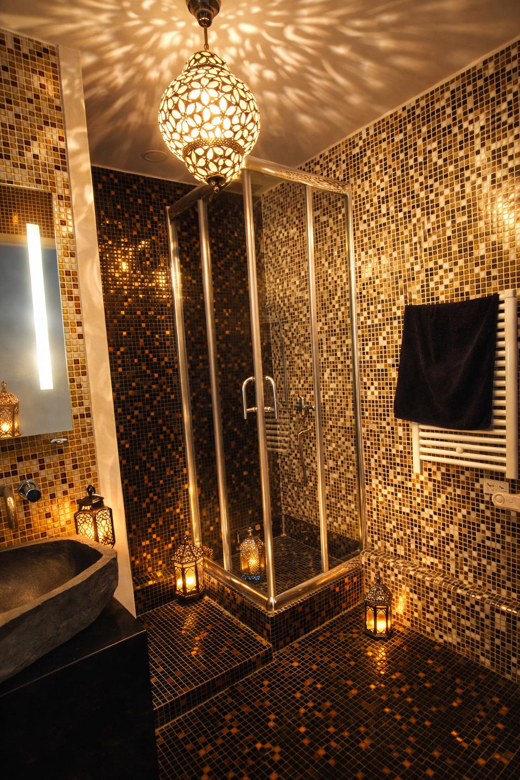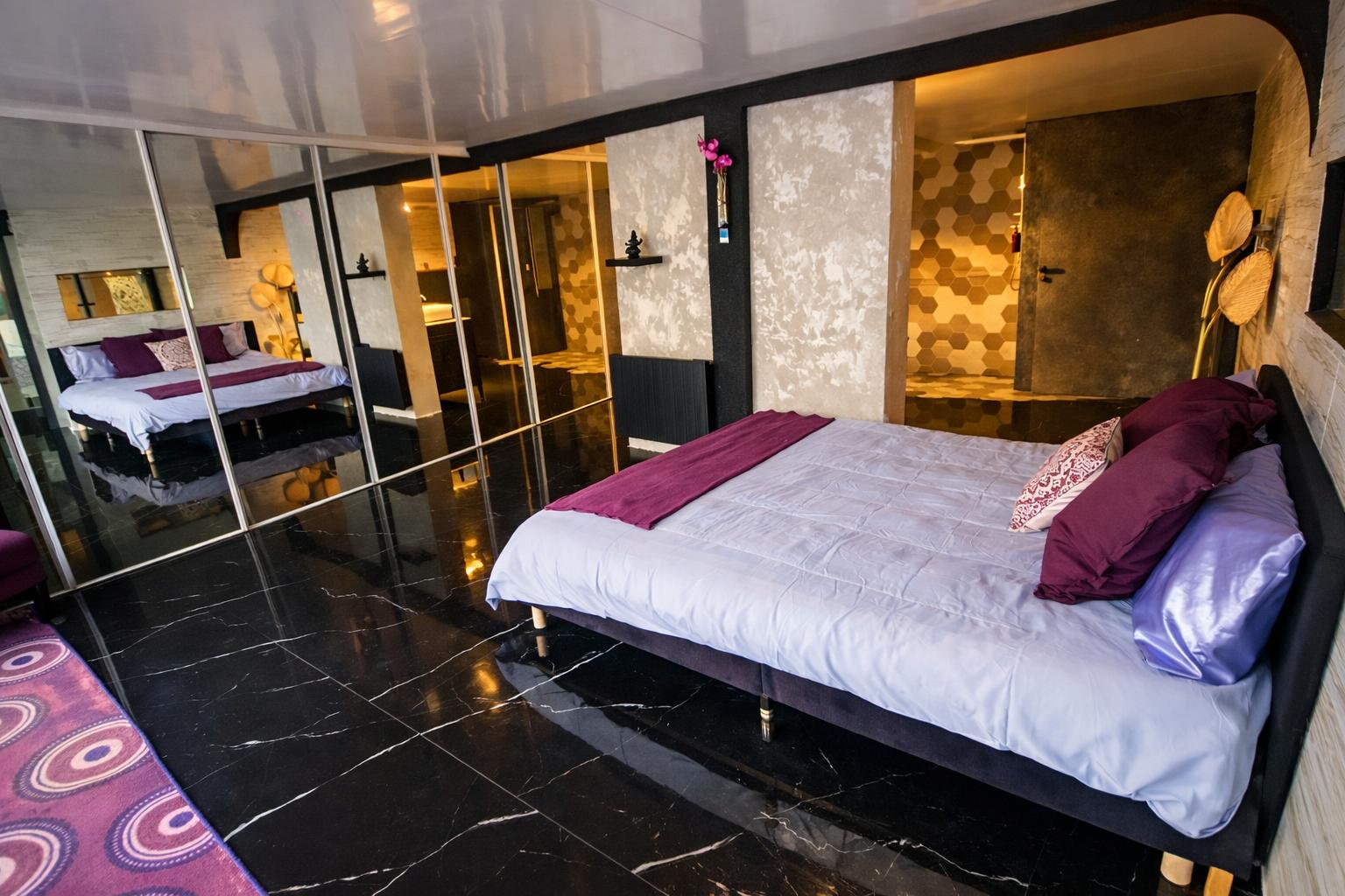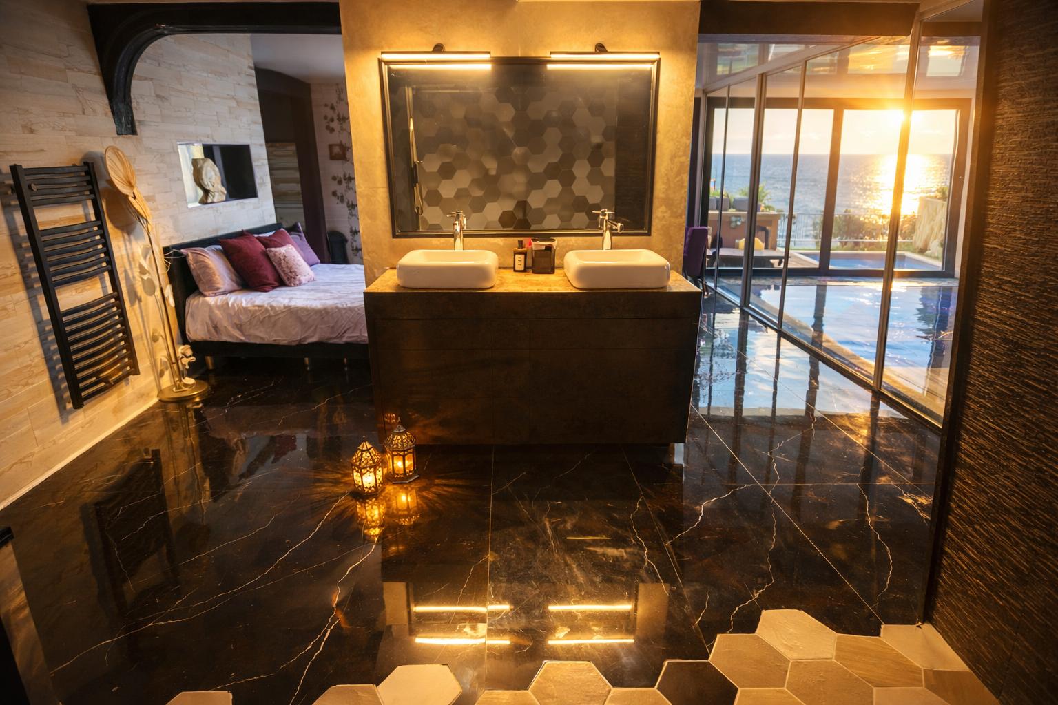4. Chambre / espace nuit : 55 m² vue mer – séparé par rideau – SDB balnéo + WC – 1 lit simple + 2 lits doubles – TV
